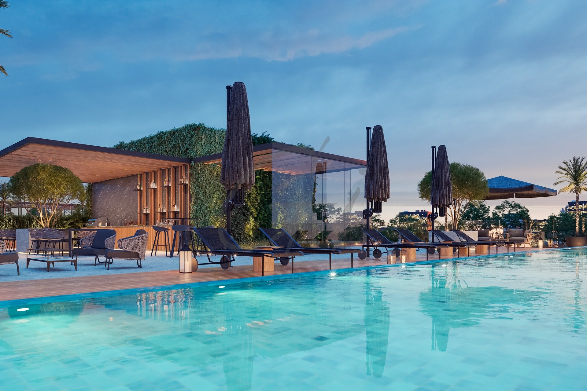 Varanda com acesso à escada que leva ao terraço, com amplo deck, piscina de tirar o fôlego e área gourmet.