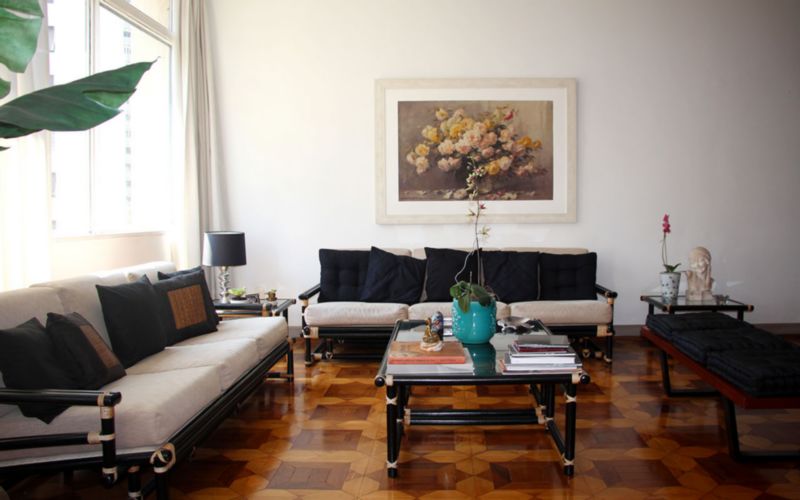 A planta característica das construções da época é cheia de possibilidades. Área social com piso charmoso de madeira e janelões.