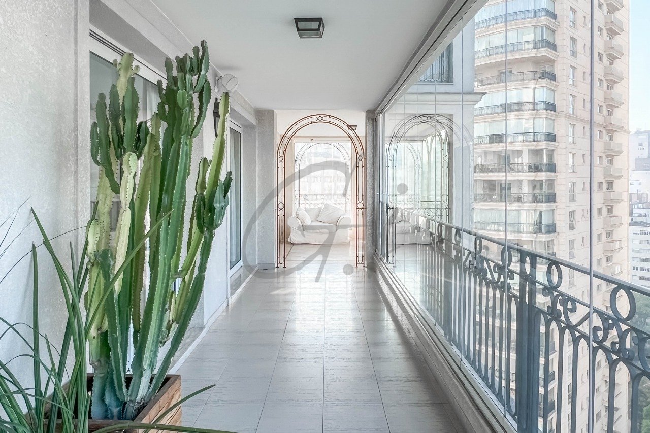 Na área social, espaçosa sala de estar com lareira, ampla varanda fechada em vidro, com guarda corpo em ferro forjado e vista permanente para o Jardim Europa. Varanda lateral com churrasqueira.