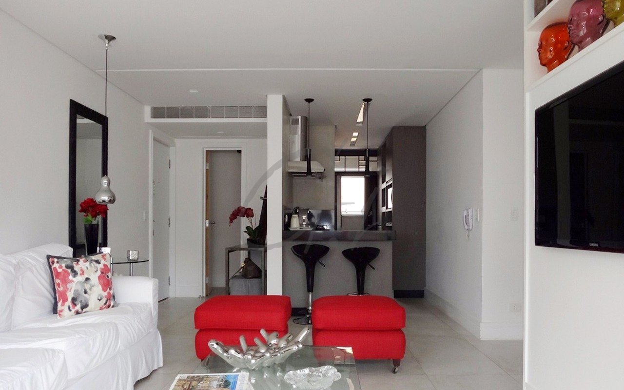 Móveis em tons de cinza, preto e branco, e alguns objetos em vermelho para dar uma aquecida.