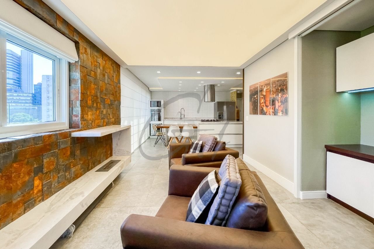 Cozinha equipada com ilha, coifa, triturador e cooktop integrada à sala.